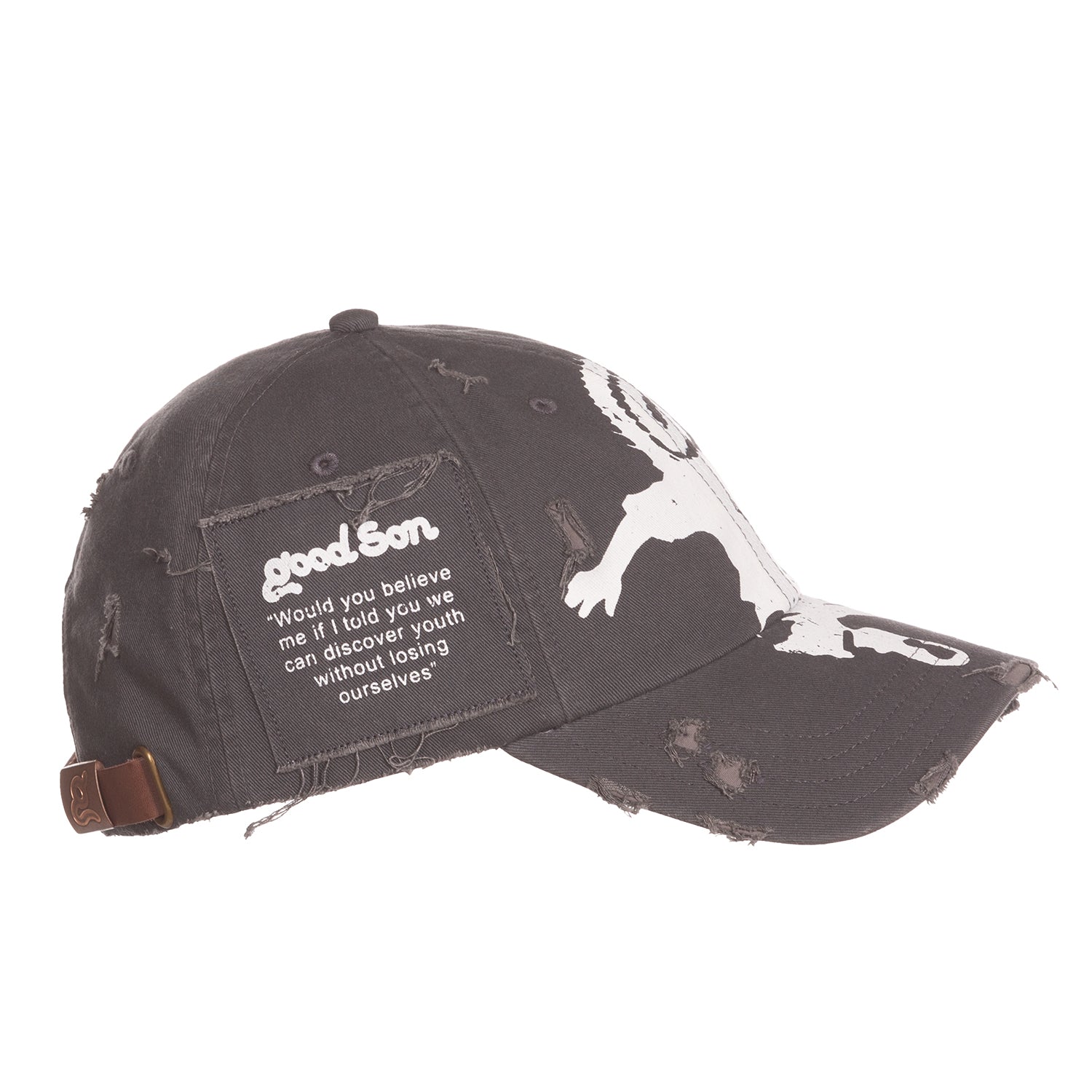The Good Jumping Hat Features our @son logo jumping across the crown. A side patch delivers the Good Son message, the hat comes with a detachable enamel pin. Finished with a premium leather strap-back closure for a fit that lasts.